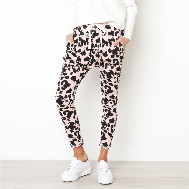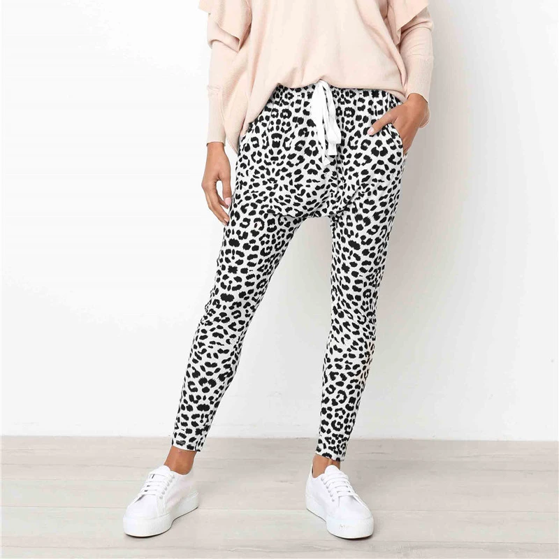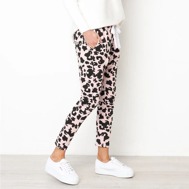 BEST Leopard Printed Skinny Pant Women Casual Mid Waist Drawstring Design Slim Pencil Pants Sport Fitnes
