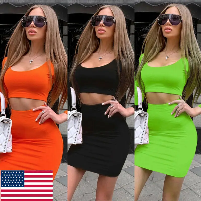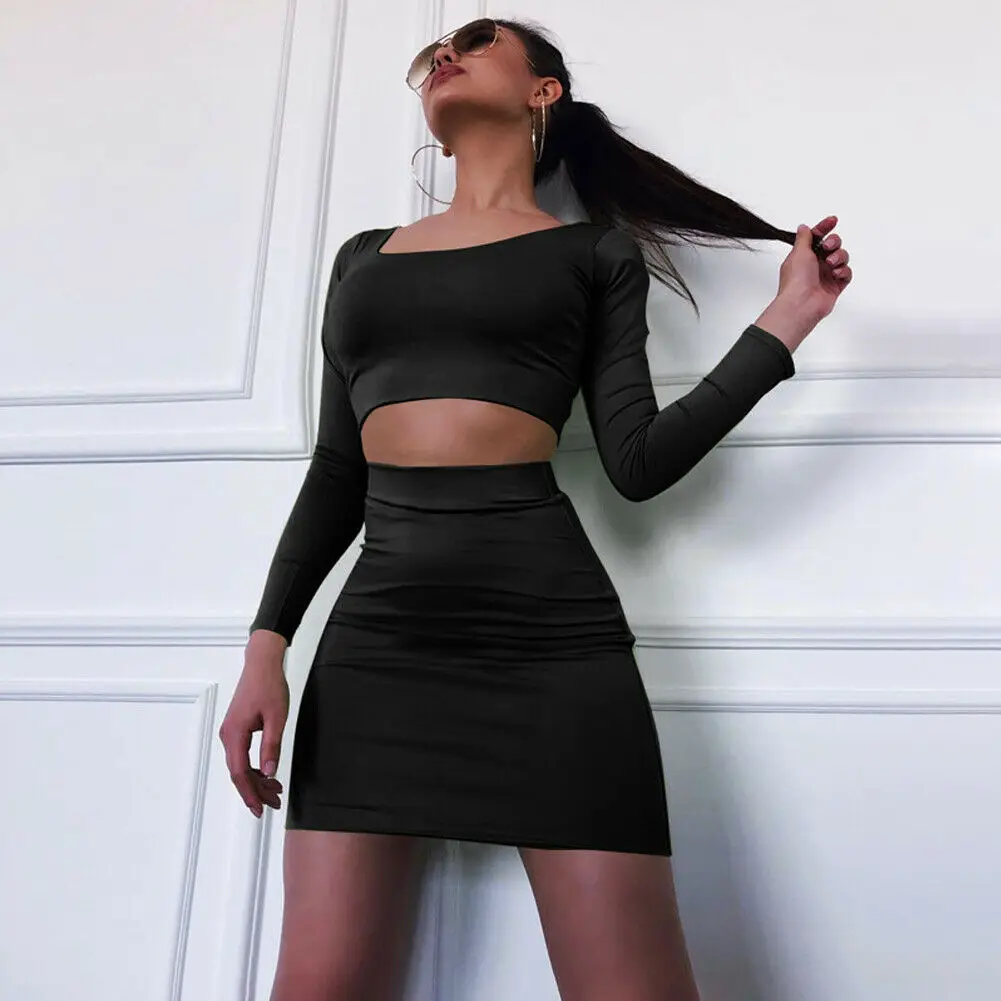 BEST QUALITY Womens Autumn Casual Shinny Fashion Sexy Women Round Neck Long Sleeve Crop Top+ Mini Skirt Sport Ou